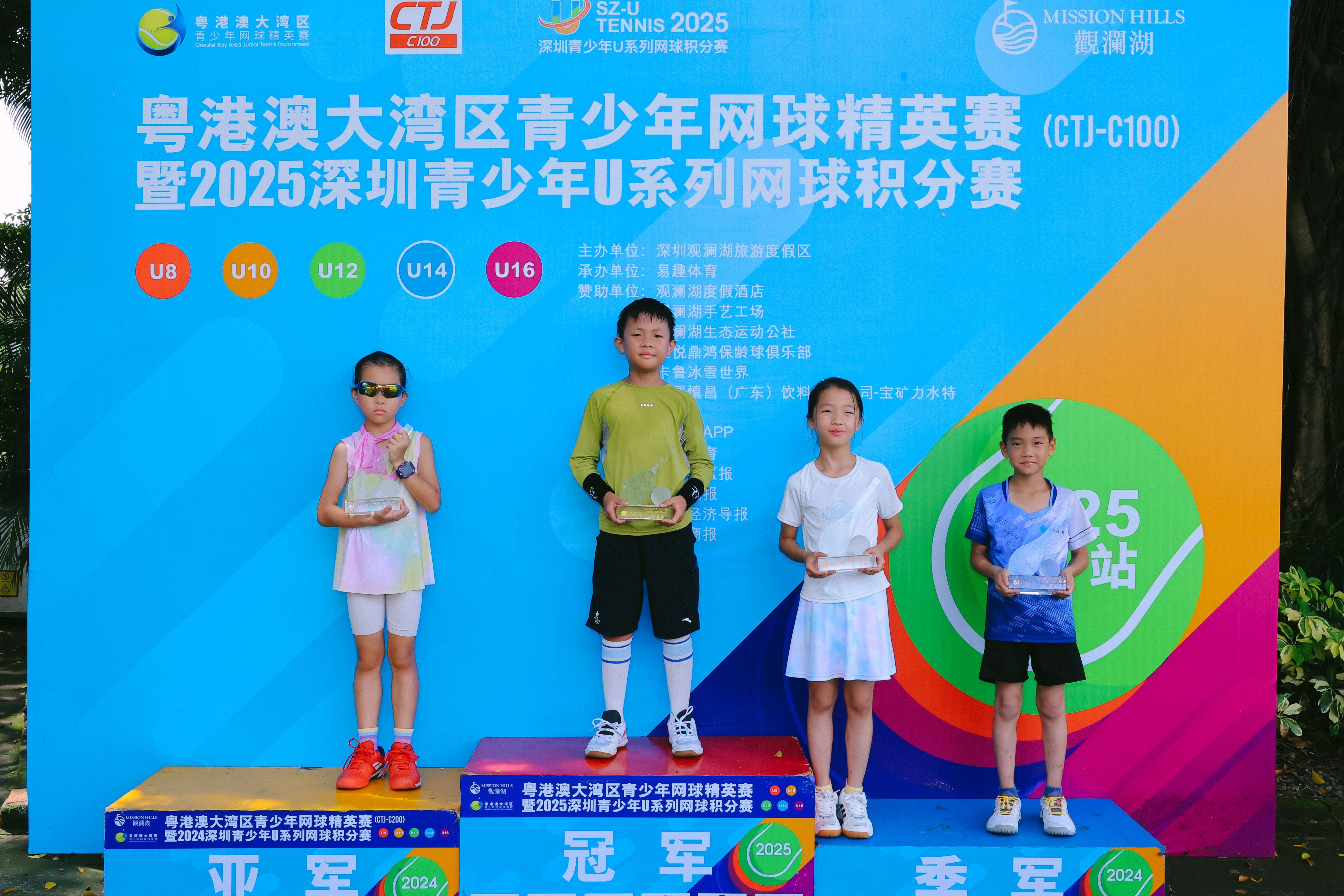 热血网球,激情盛夏。7月26-27日、8月9-10日,粤港澳大湾区网球精英赛暨2025深圳青少年U系列网球积分赛第一站(CTJ-C100)在深圳市观澜湖生态运动公社网球中心进行。本次比赛经过四天激烈角逐,决出U8短网、U10男女单打、U12男女单打、U14男子单打、U16男子单打七个组别冠军。
